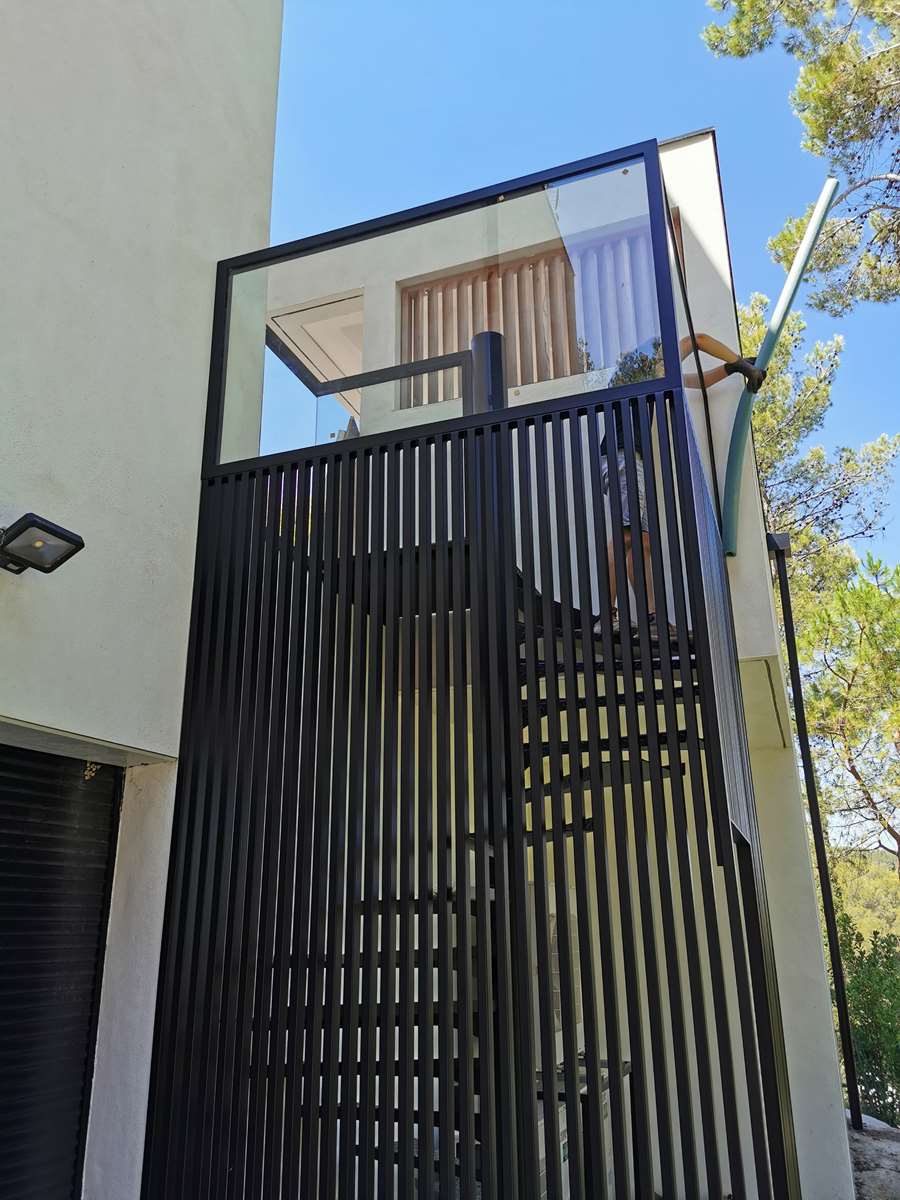 Projet d’envergure, création d’un escalier colimaçon de plus de 3 mètres de hauteur totalement habillé d’un claustra en aluminium noir.