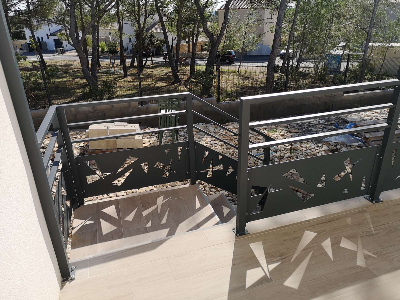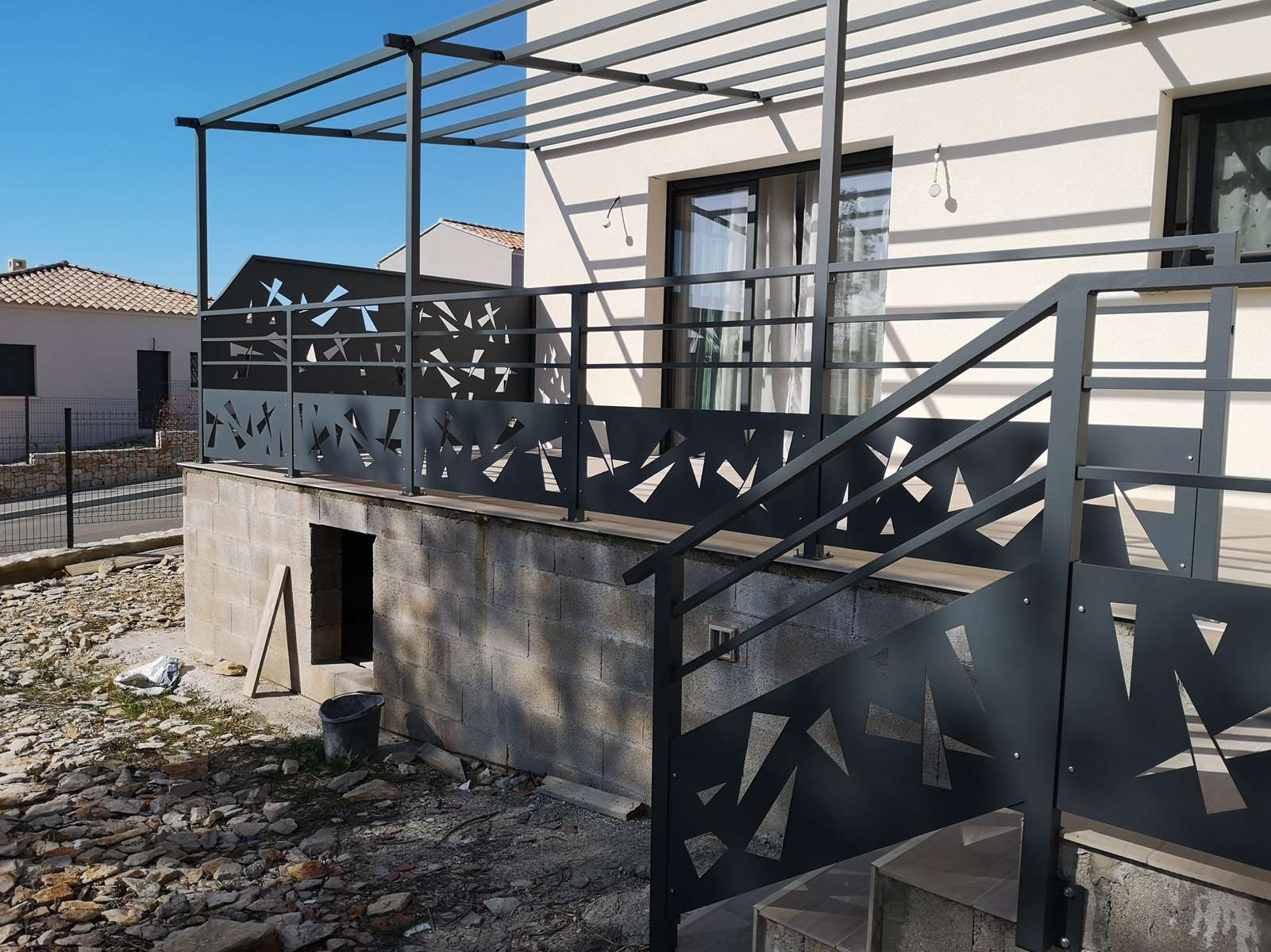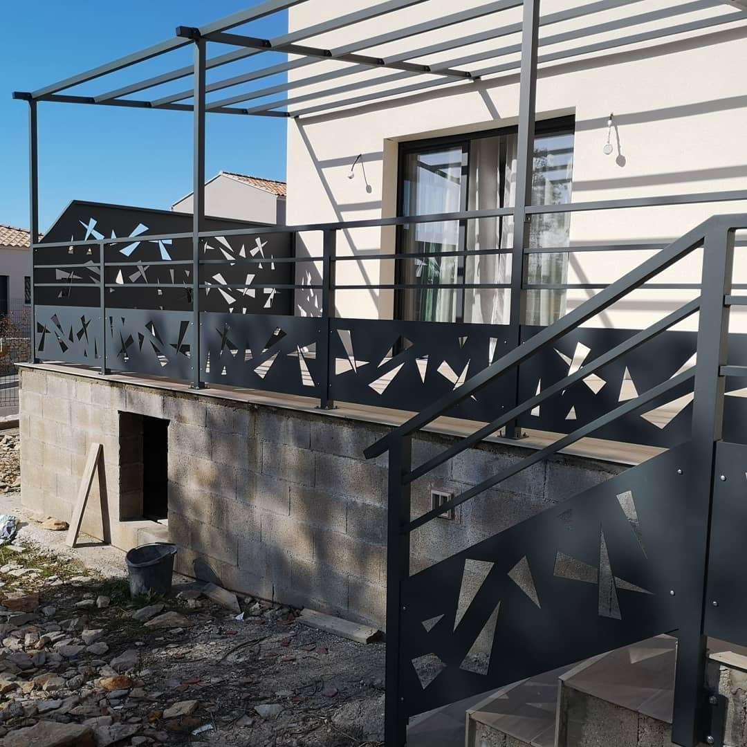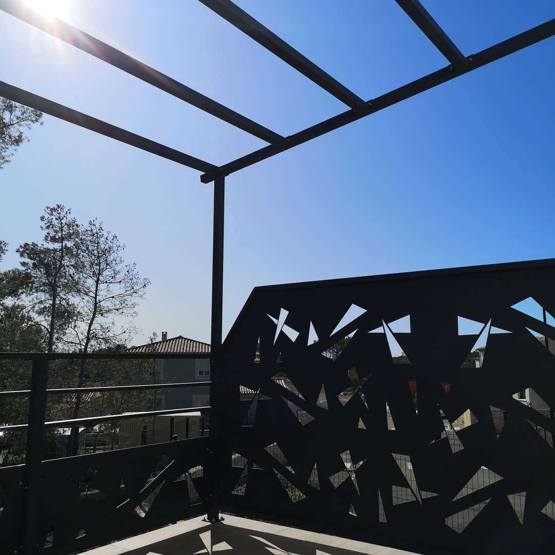 Création et installation d’une pergola avec gardes corps en alulminium, pour une terrasse d’une villa neuve.