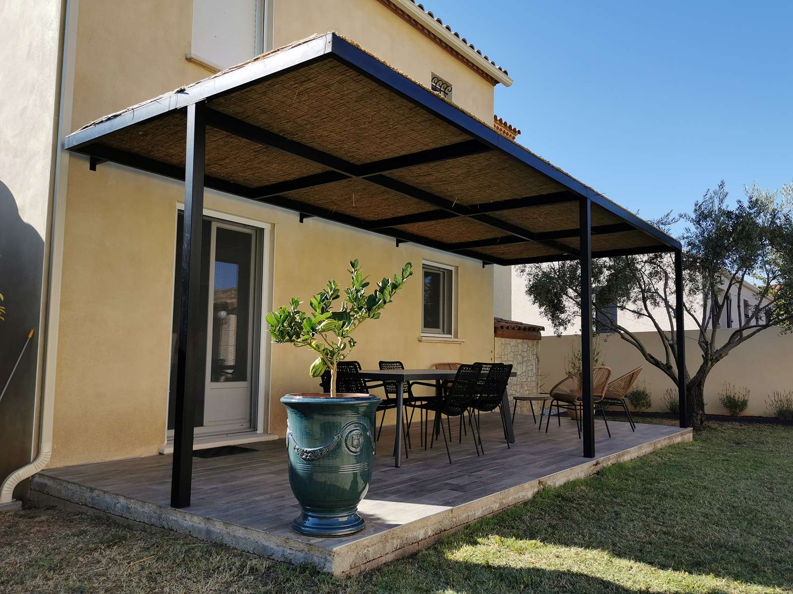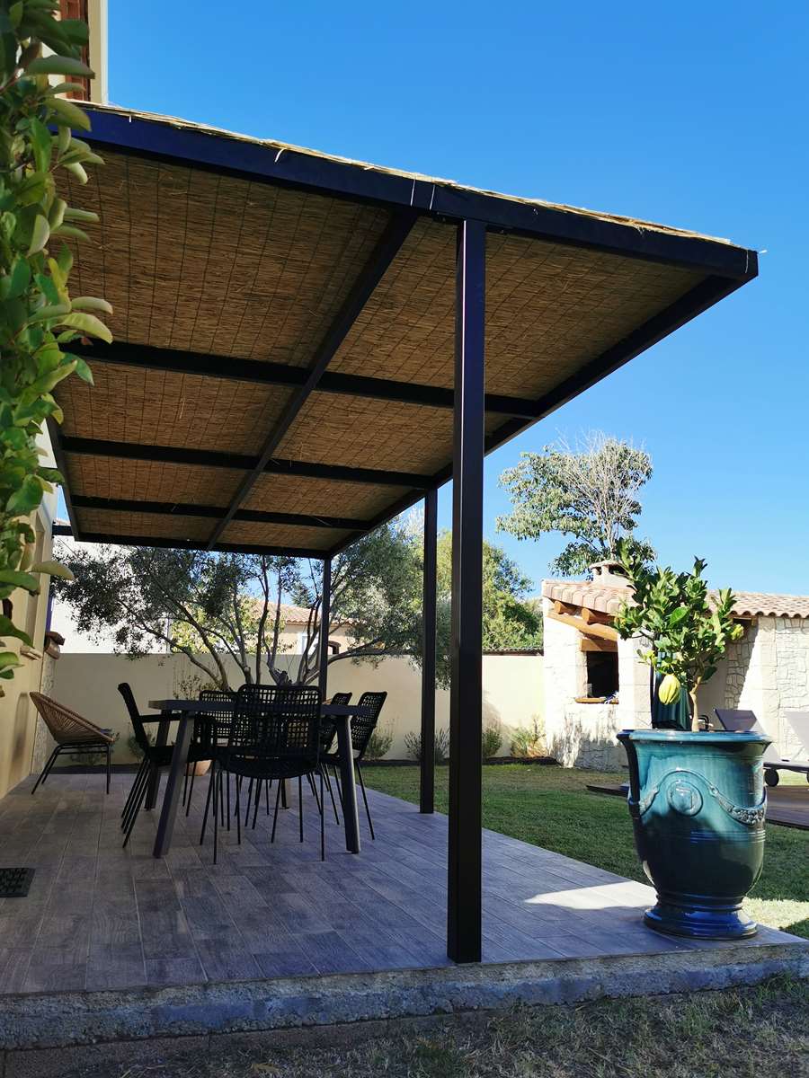 Création et installation d’une pergola sur mesure, avec une couverture en canisses.