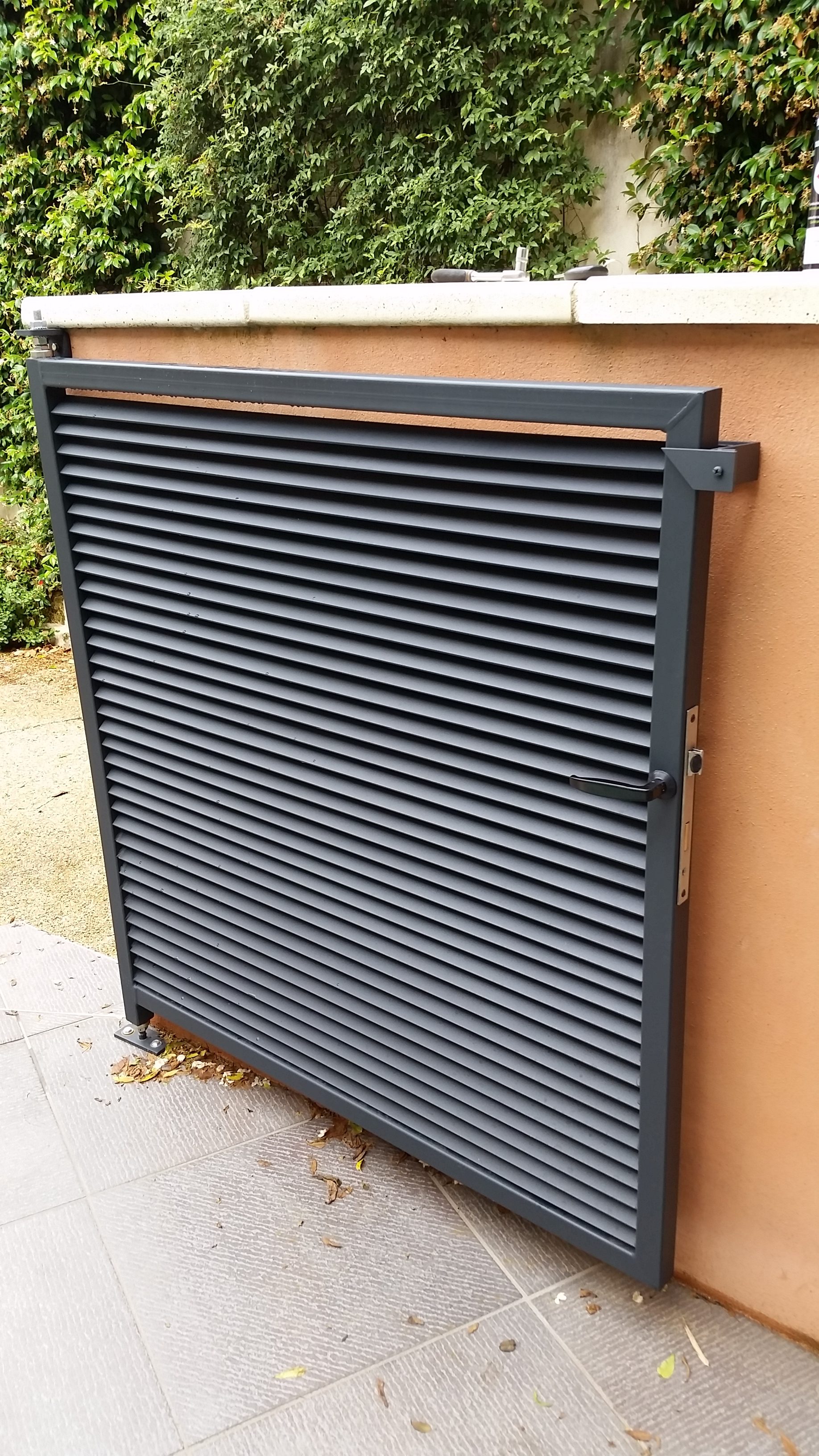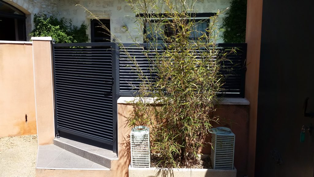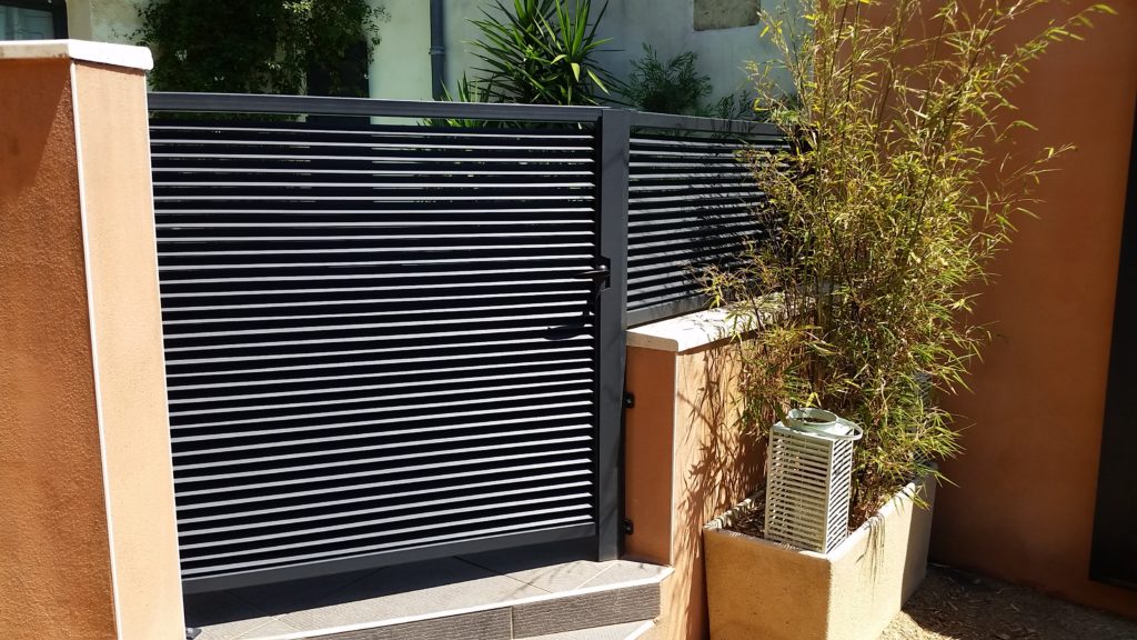 Création et installation d’un portillon avec son garde corps brise vue en persiennes.