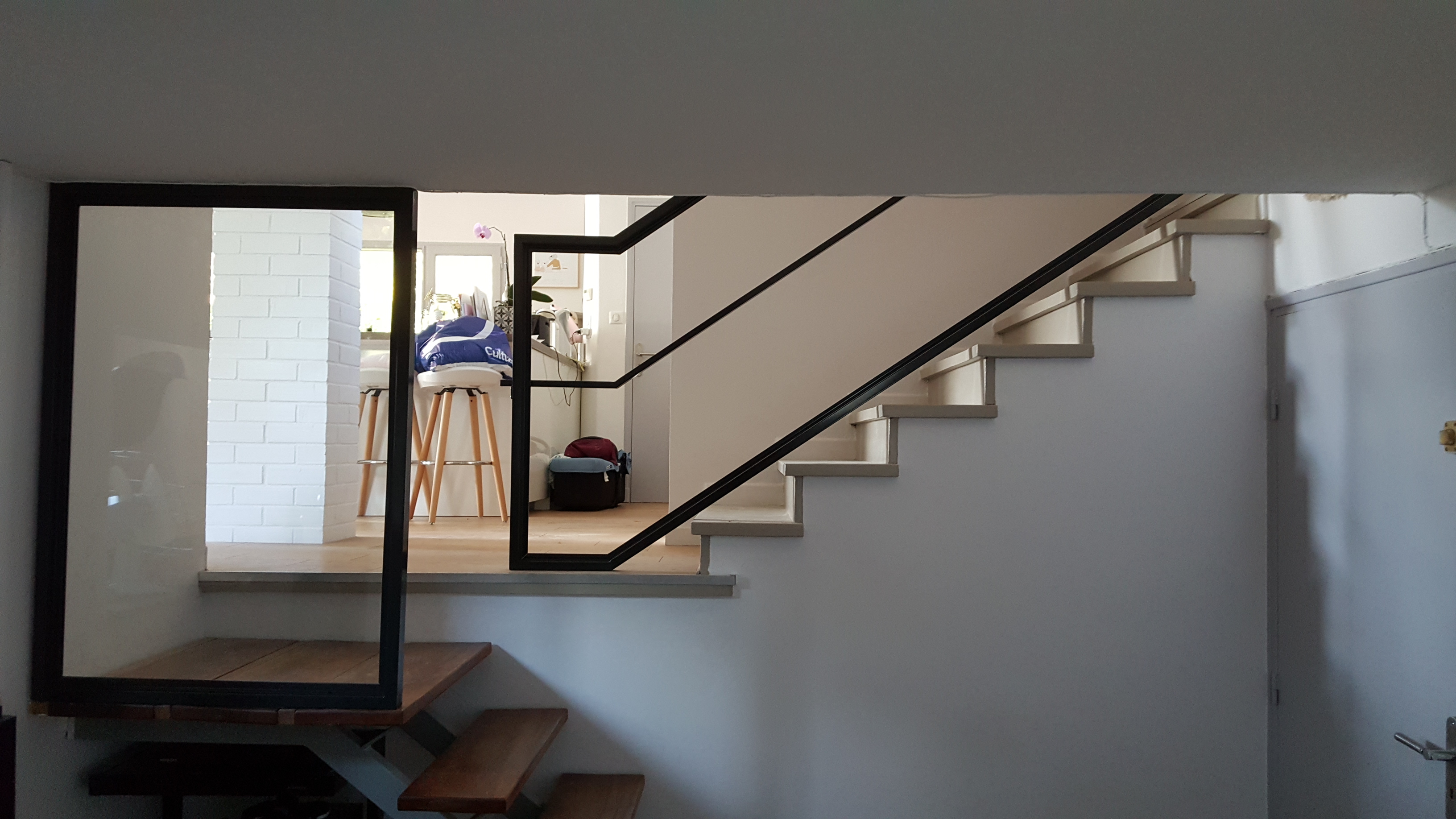 Nous avons donc opté pour une rampe style verrière habillée de verre afin de la rendre discrète et design, décoration minimaliste.