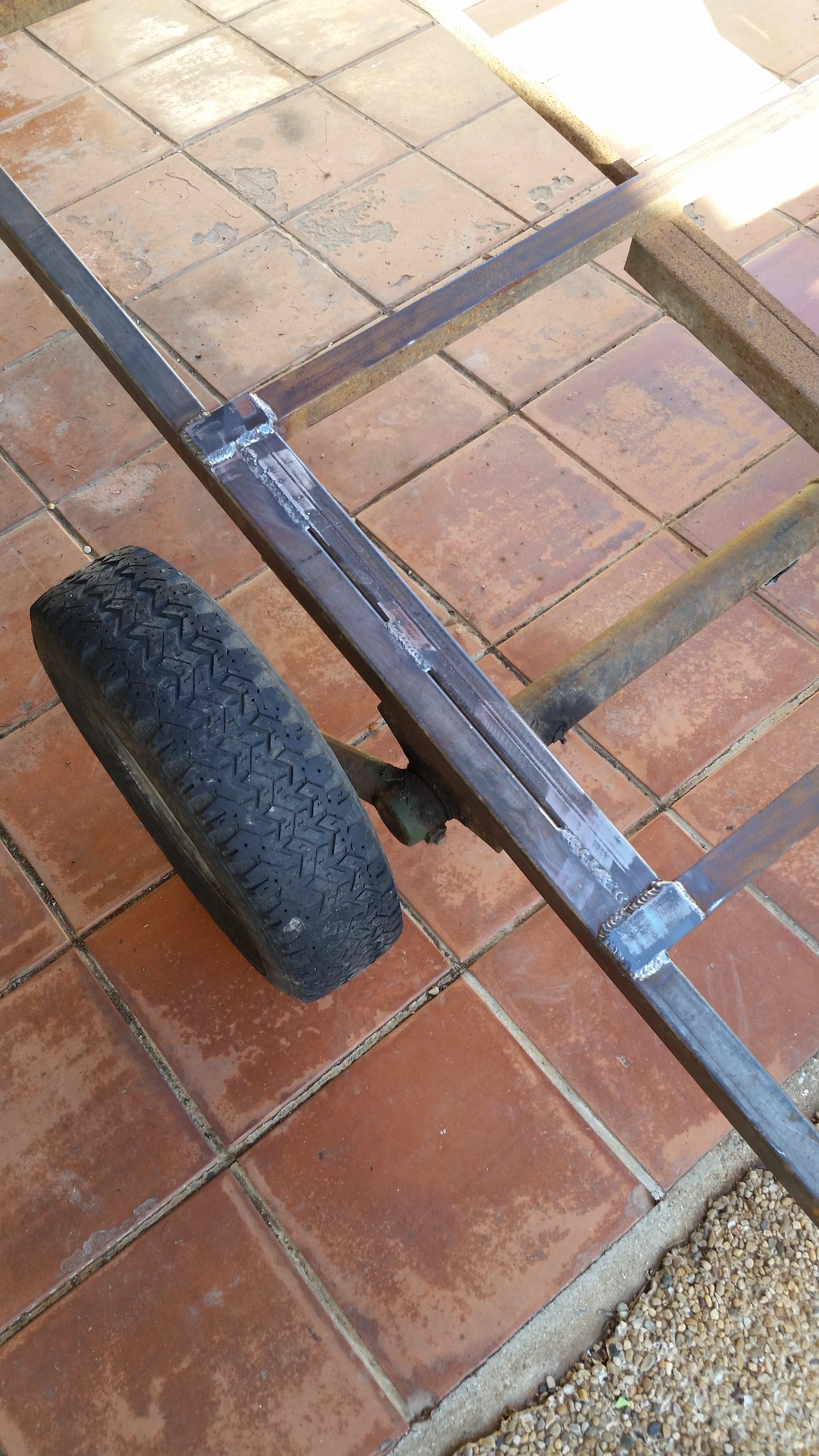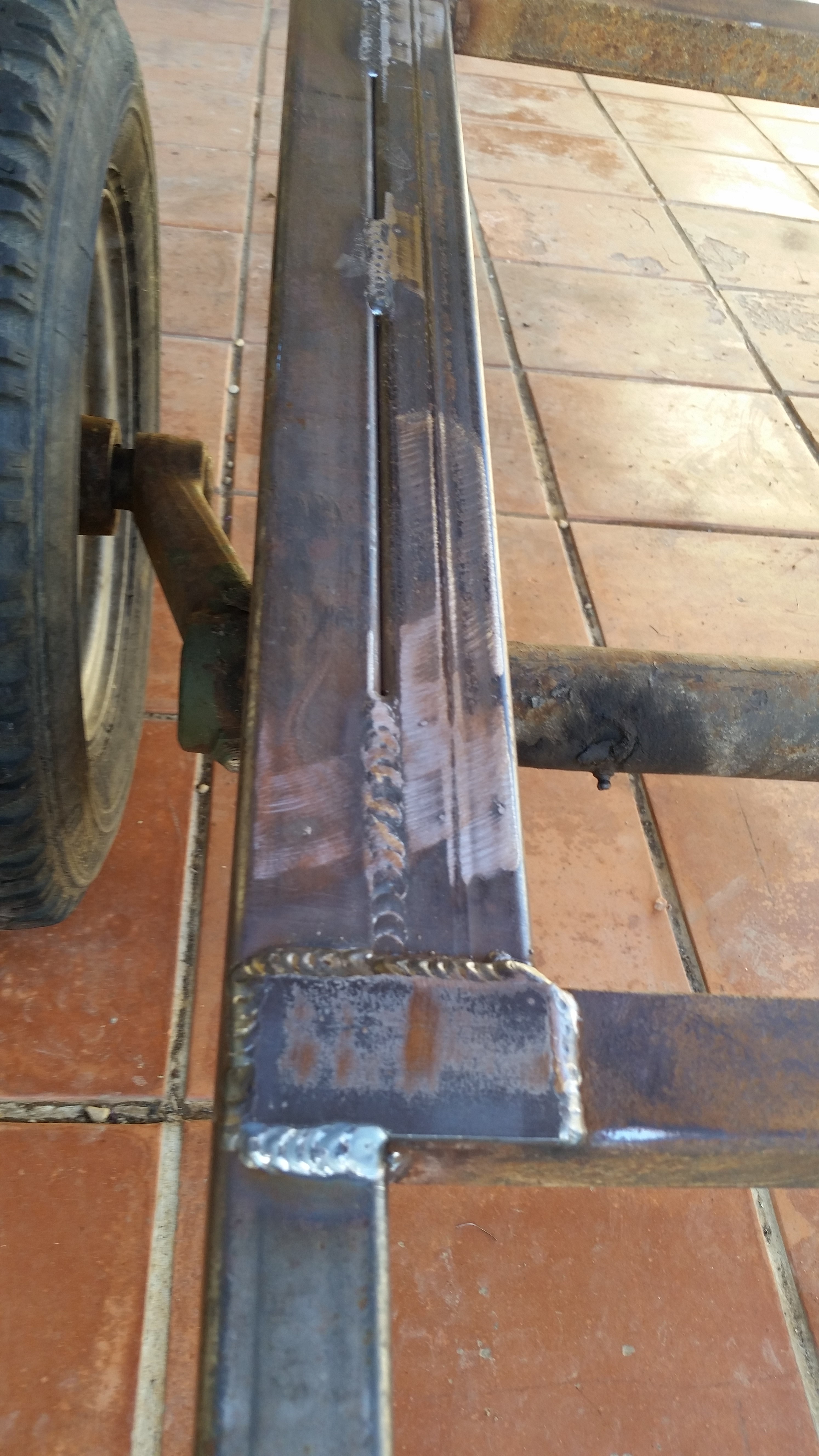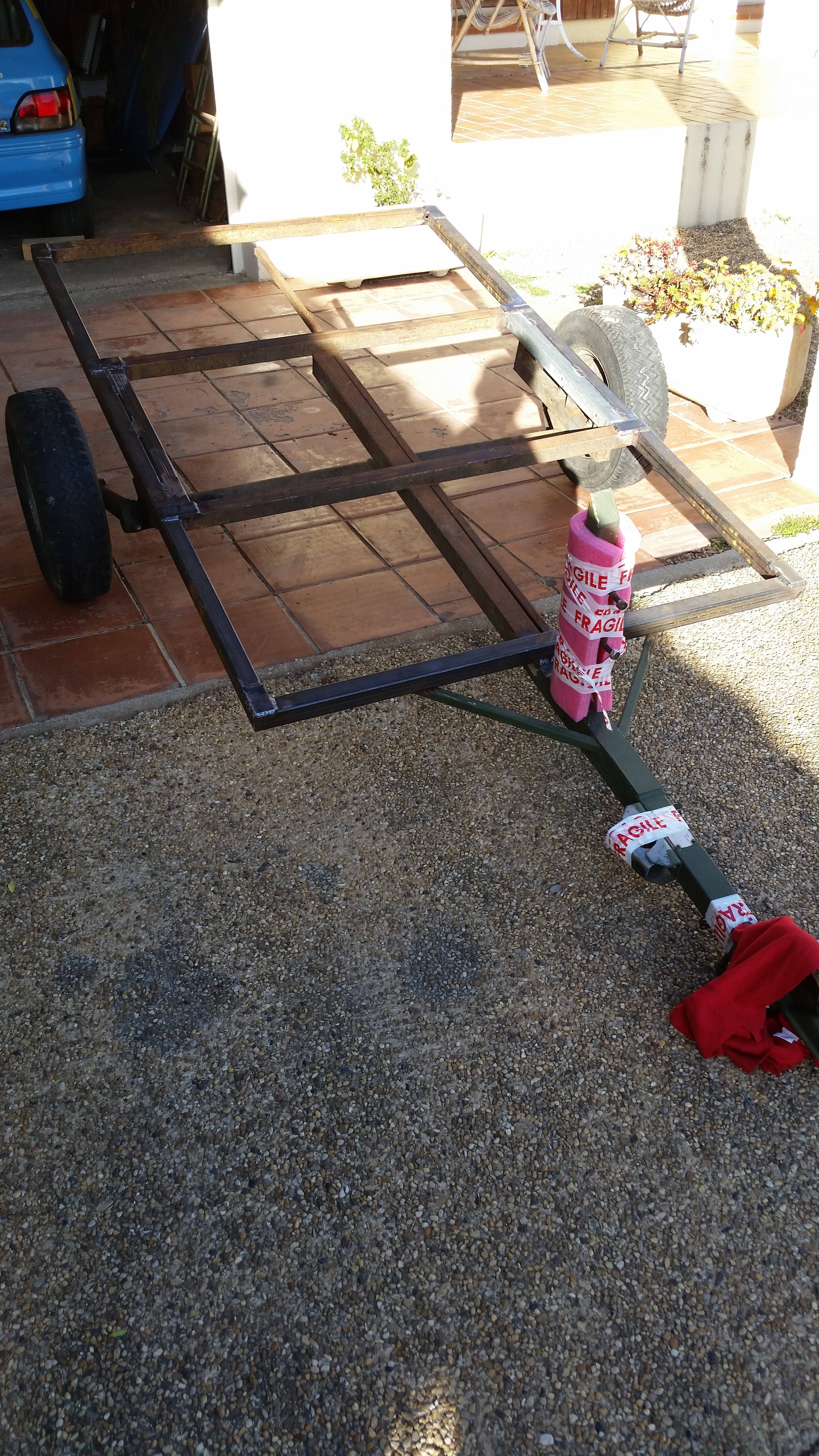 Restauration intégrale d’une vieille remorque plateau. Armature en acier soudée.