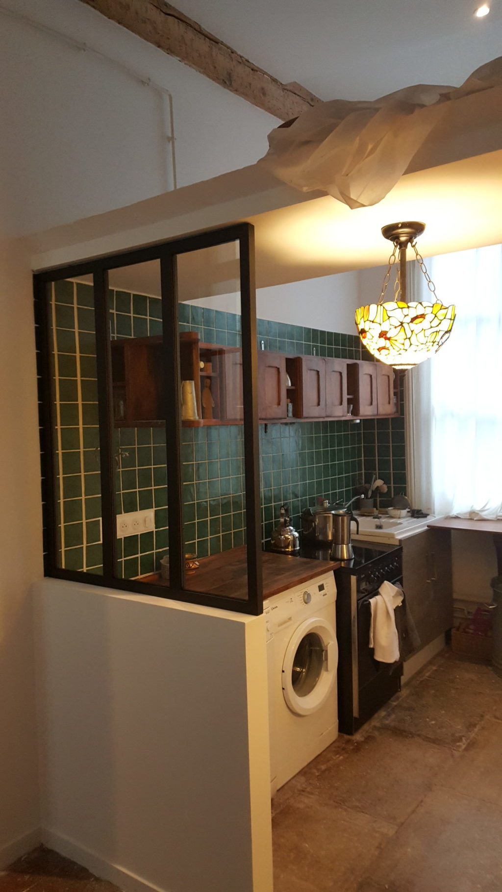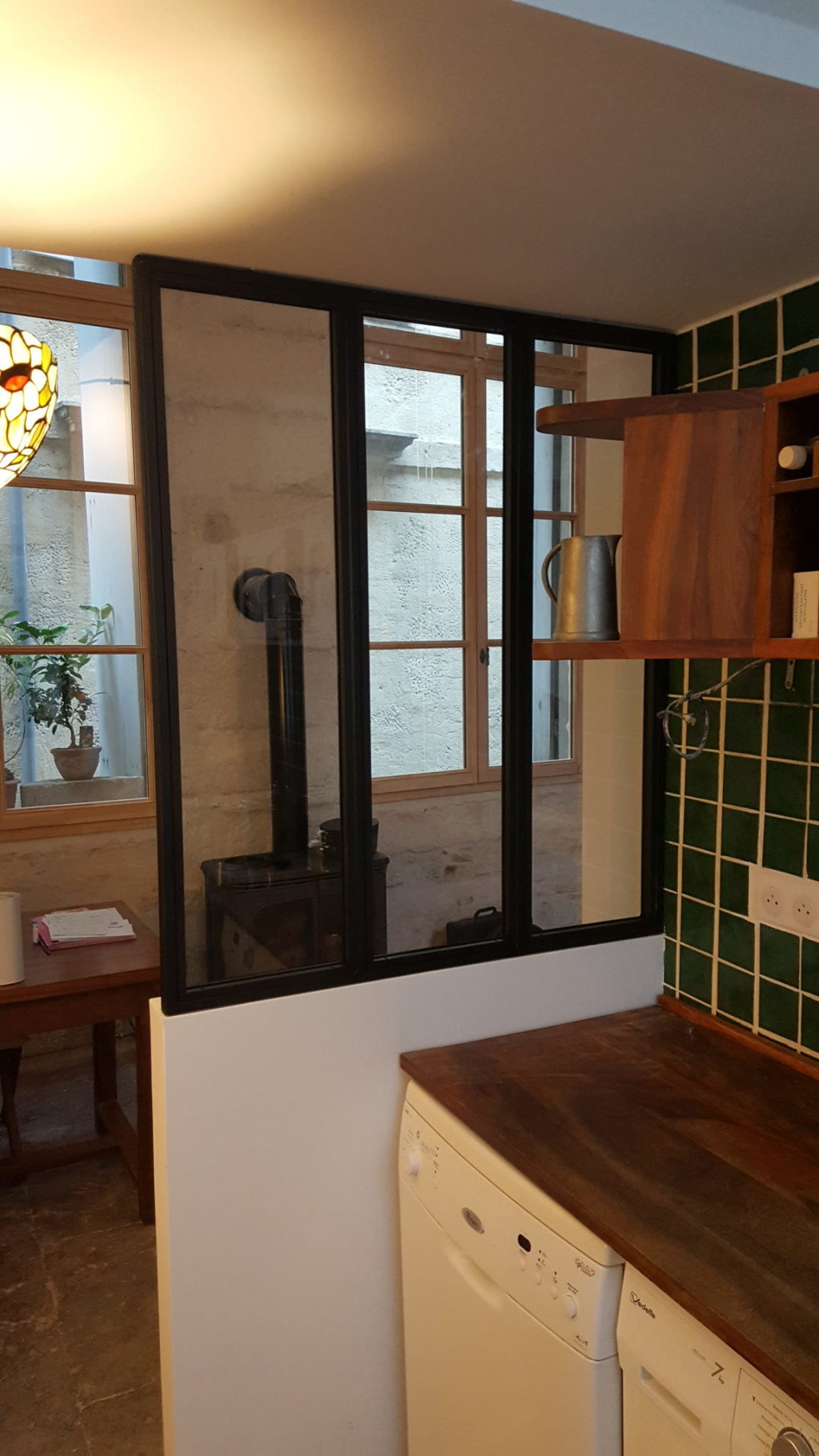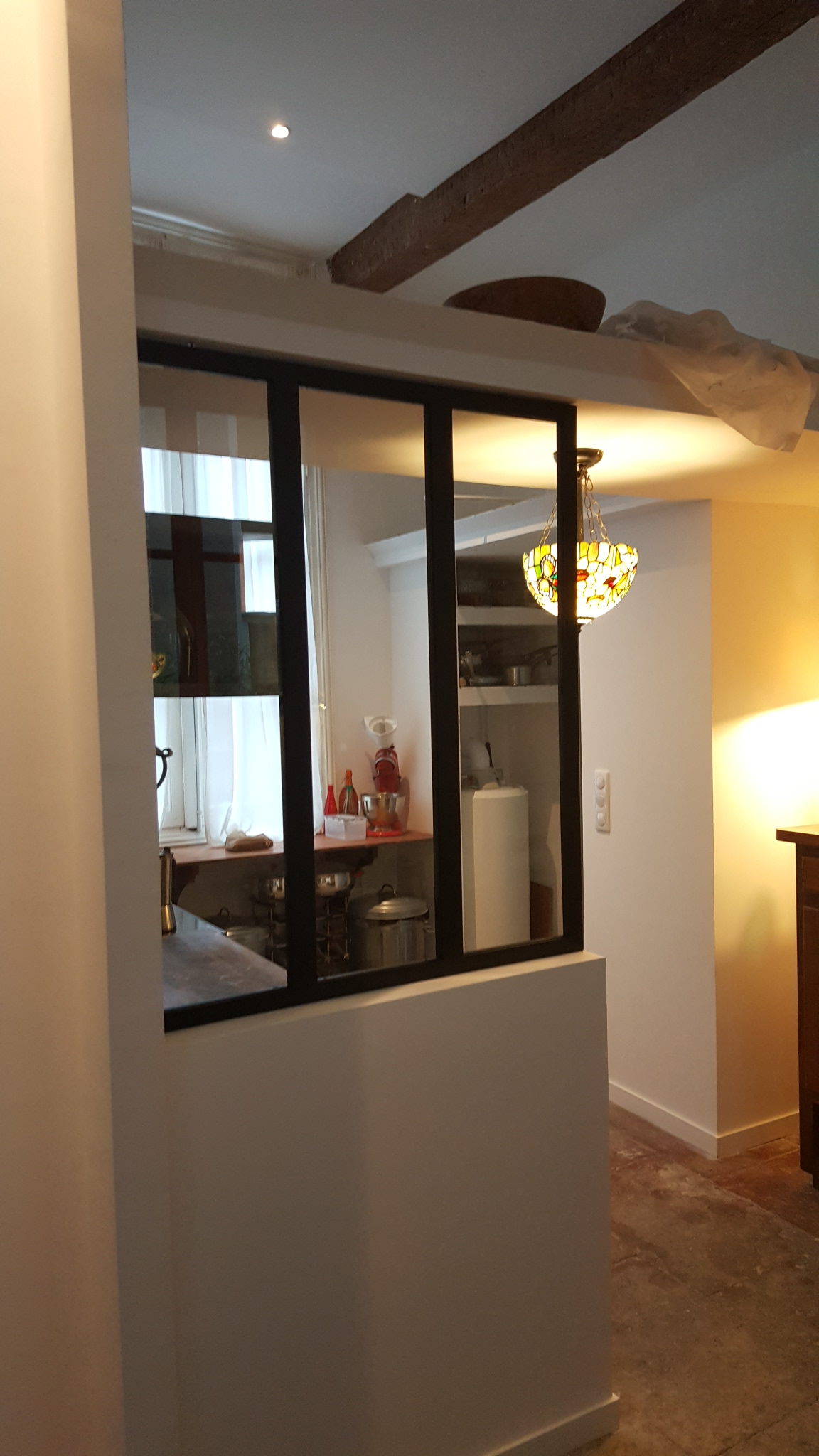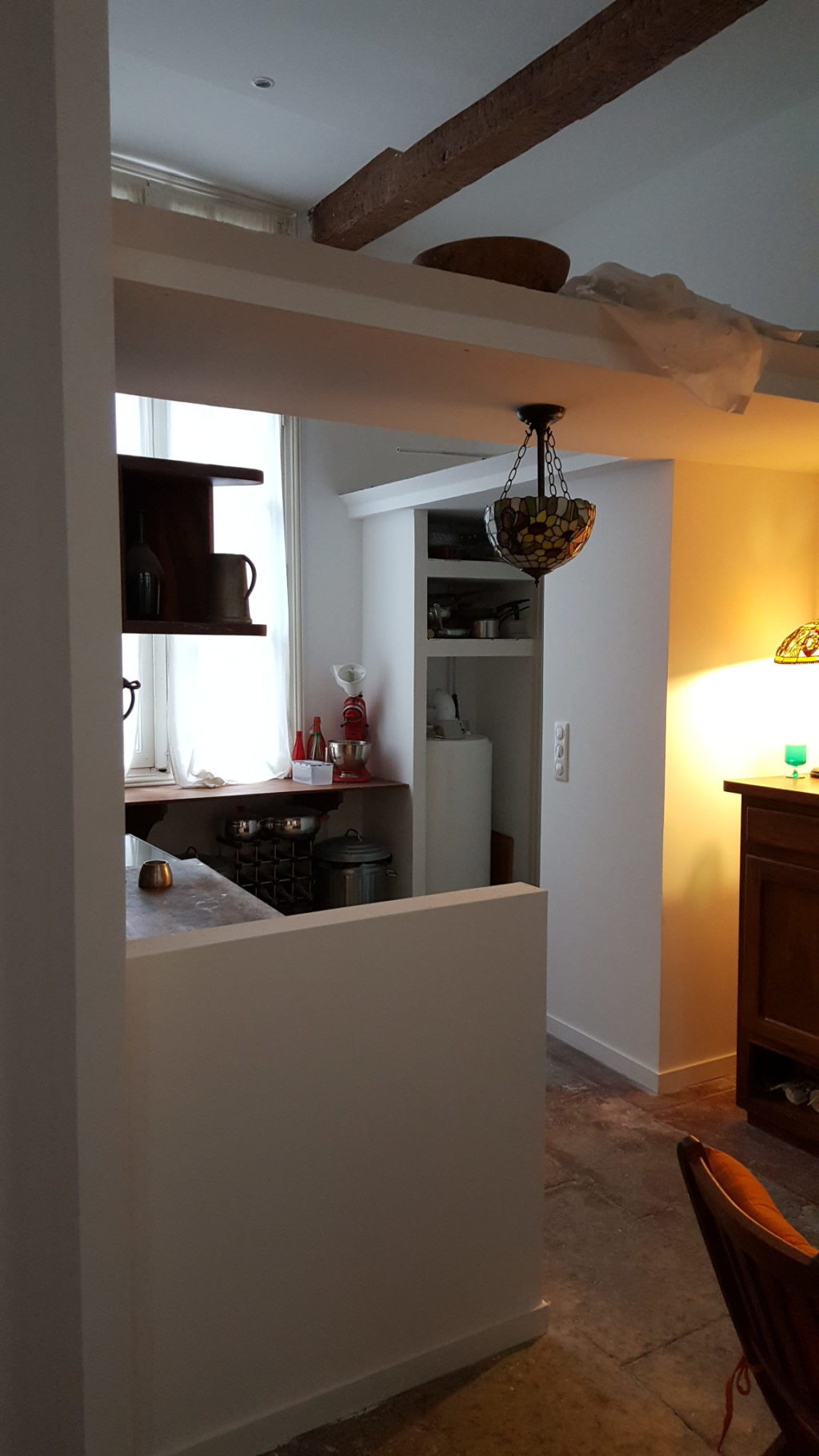 Fixée sur un soubassement en placo, elle assure une séparation entre la cuisine et l’espace salon – salle à manger.